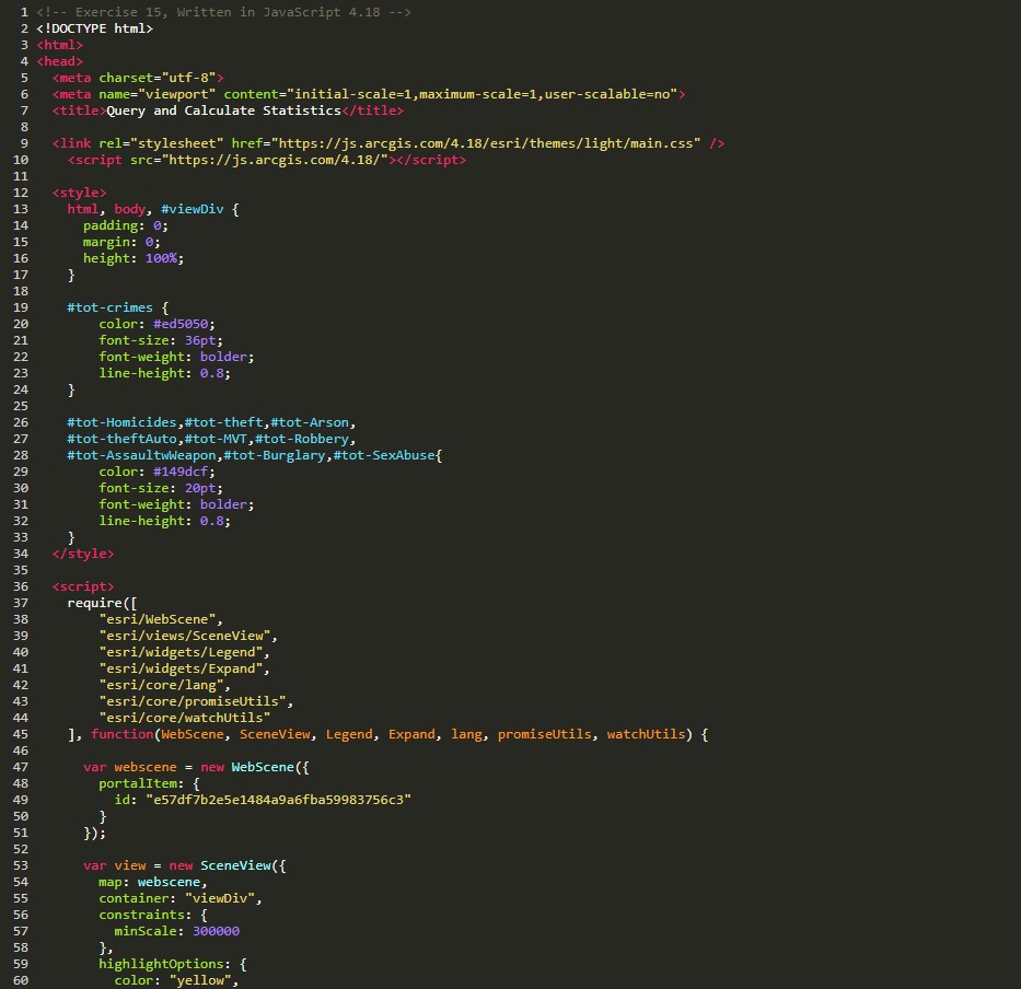 3. Let's use the portal id for a new web map that contains crime data and use this webscene in the view. Notice that we are setting some addtional properties on the view like the constraints of minScale and highlightOptions. Look at the links to get more info and play around with some different properties as you build out this lab.