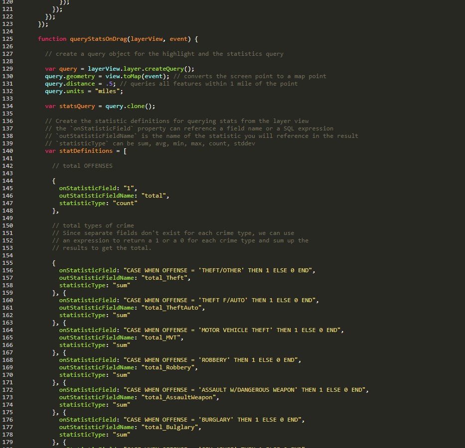 8. What does the queryStatsOnDrag function look like. It looks complicated but it really isn't. First we create a query on the layerView that is passed in. Then we use the event as the geometry and set the distance for the query. Then we clone the query so we can use it also for the stats query. Next we define the array of statDefinitions to count up how many crimes and of what type are found within the query. Then we do the query against the layerView to get the stats. Next we use the query with the distance set to highlight the features that are selected. Here is where we use the highlightHandle from above that we set to null earlier. We need this because if we don't remove the previous highlighted features they will just accumulate as you drag around the view.