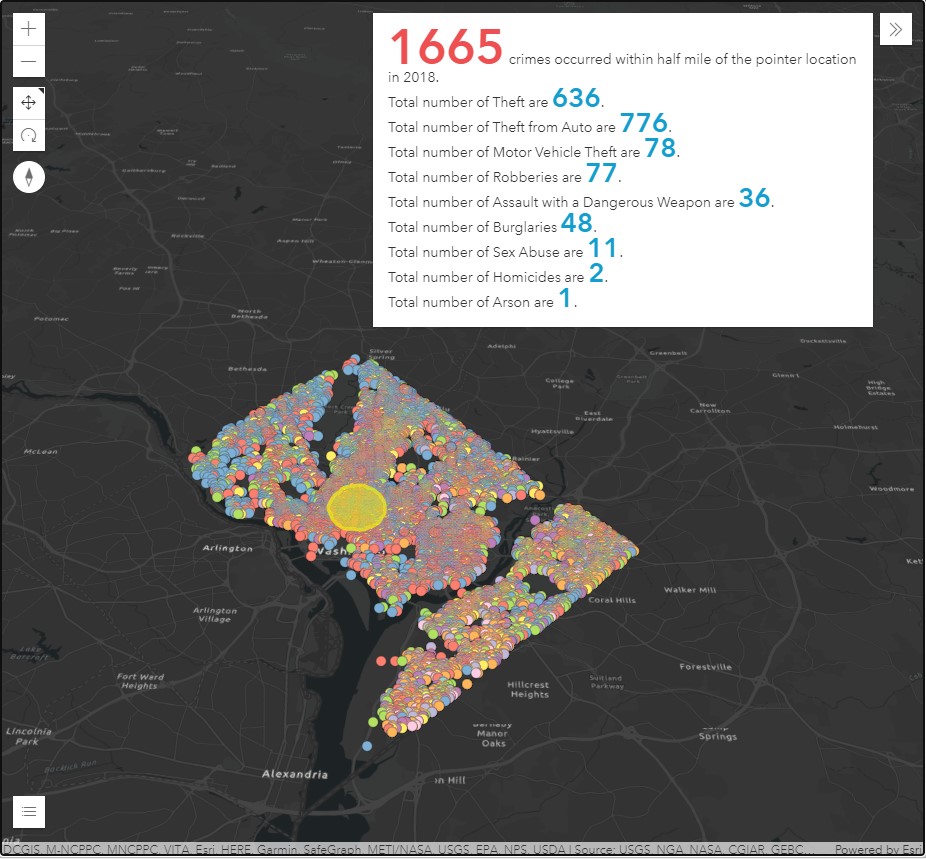 "<span id='tot-crimes'>0</span> crimes occurred within half mile of the pointer location in 2018.<br>",