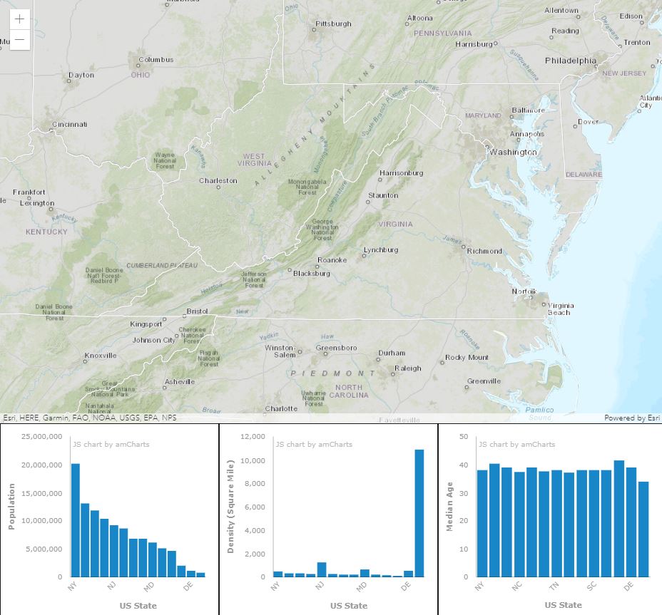 In this lab you will use the Cedar library to create charts that will dynamically update based on the map extents. The charts will depict demographic data that includes Total Population, Density, and Median Age for each US State that lies within the map extents.