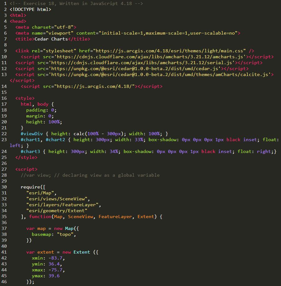 2. Next add the JavaScript URLs for the Cedar library. Add these below the style tag. You will need to remove the original link to the ArcGIS JavaScript library and place it below the Cedar library scripts: