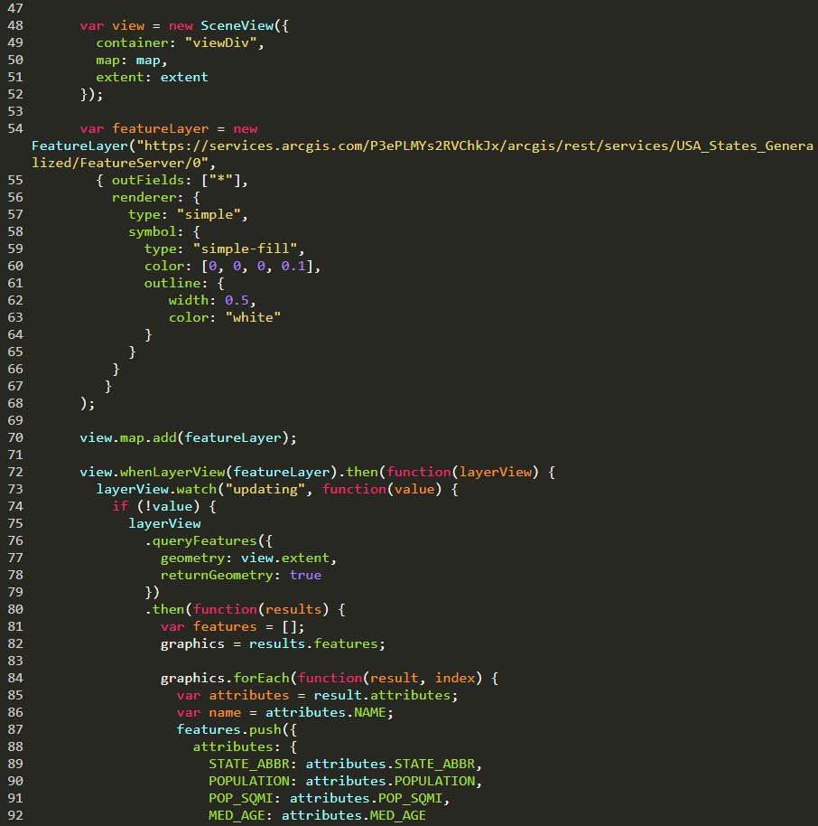 3. Update the require statement and function definition with "esri/layers/FeatureLayer" and "esri/geometry/Extent". Change the basemap to Topo, edit the map location, and add a feature layer. This layer depicts the US states and includes multiple demographic attributes.