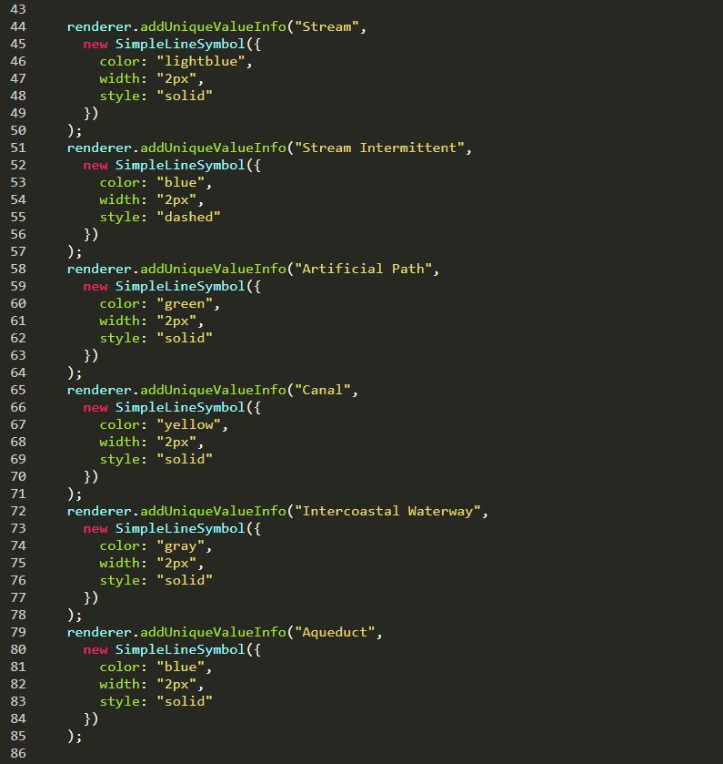 We will be using the SimpleLineSymbol to style this layer and UniqueValueRenderer to render the style.