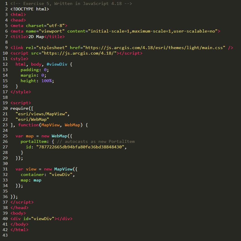 In this lab, you will use the ArcGIS API for JavaScript to load a WebMap by its portal ID in a custom JavaScript app.